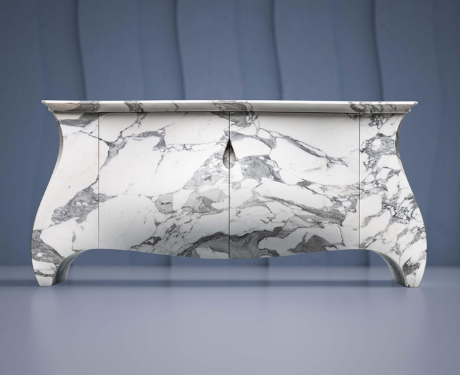 The sideboard features two hand-finished, intricately carved doors. Its flowing design takes inspiration from the opulence of Rococo and the grandeur of Louis XIV, creating a sense of movement and luxury that belies the weight and permanence of stone. What makes the piece truly unique is its seamless marble grain—flowing uninterrupted across every surface, wrapping the cabinet in natural artistry.